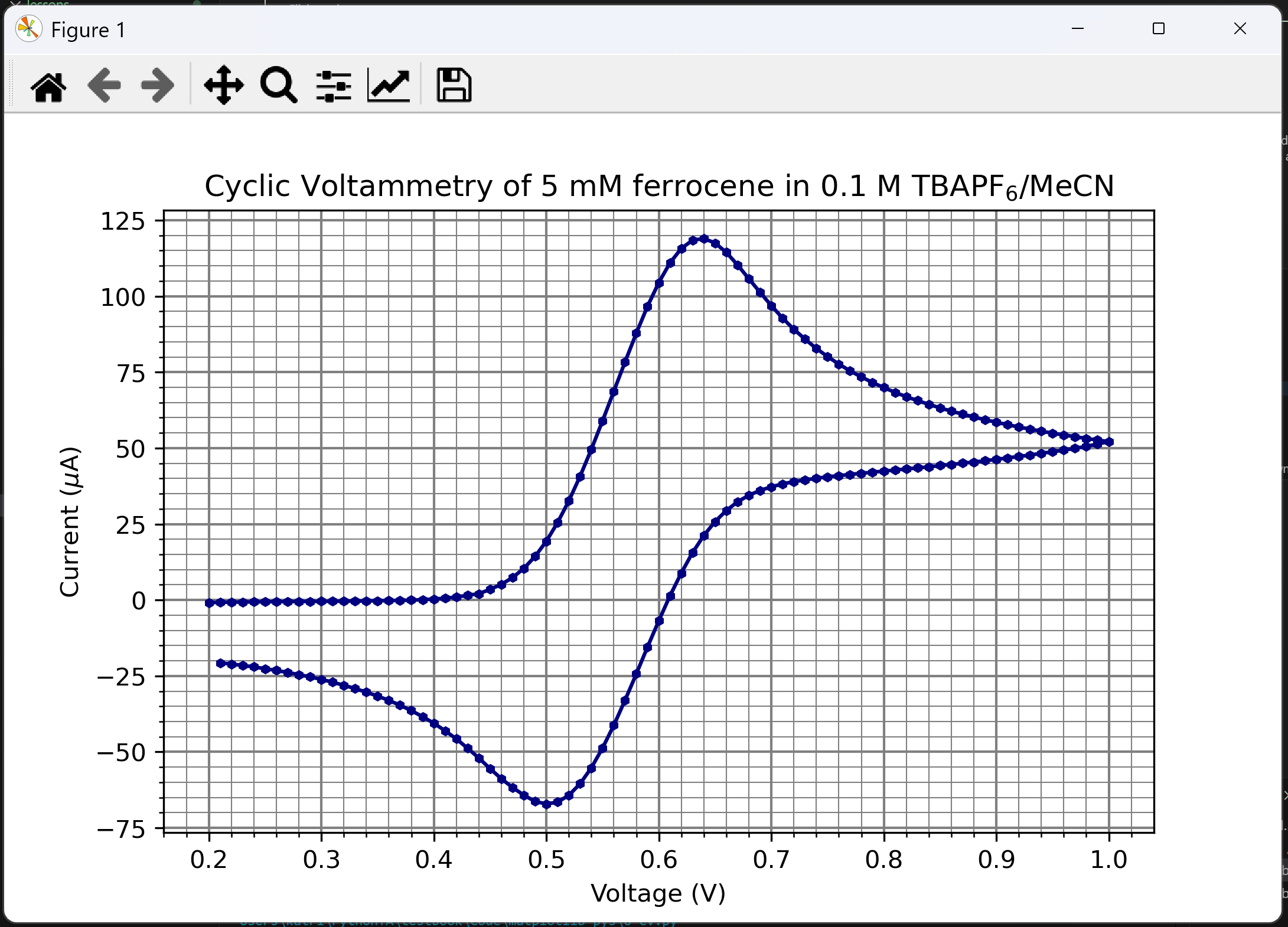 You should get a voltammogram that looks something like this (make sure to relabel the title and axes appropriately!):