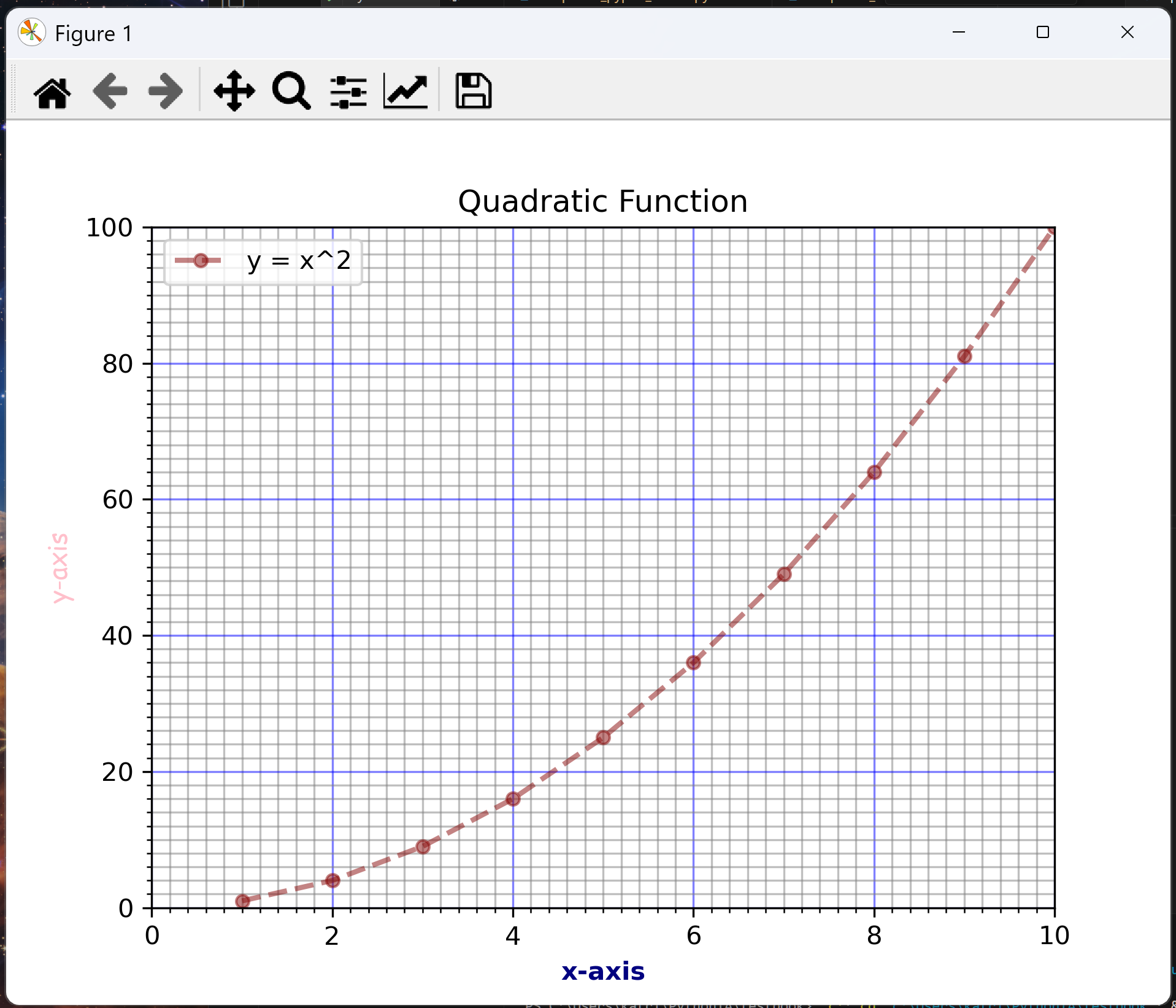 Here is an example of our quadratic function plot customised with gridlines, ticks, and limits.