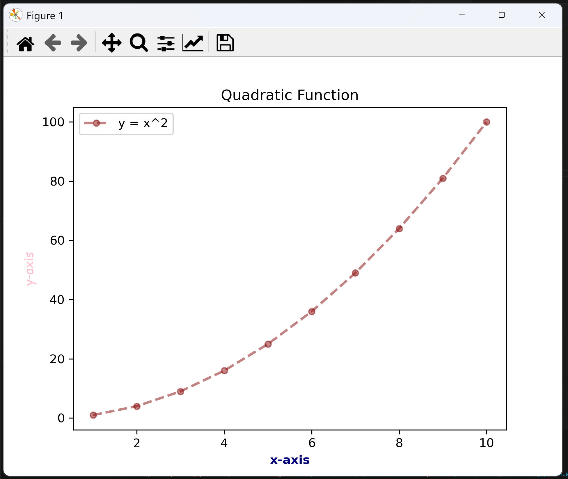 colorchanges the colour of the line. It can take certain named colours, such as"red","green", and"papayawhip", etc., or hex code colours, such as"#880808". If you do not use thecolorkeyword, the line will take a default colour, usually blue. A full list of Matplotlib supported colours can be found here.linestylechanges the style of the line. Without the keyword, this defaults to a solid line. Other inputs could be"-"(solid),"--"(dashed),":"(dotted),"-."(dashed-dotted), or""/"None"(draws nothing).linewidthchanges the thickness of our line. The default is 1.markerchanges the marker at each plotted point. By default in a line diagram these would be"None", however in a scatter plot these are a dot by default. Other kinds of marker could be"x"(a cross),"s"(a square),"D"(a diamond), or"v"(a downwards triangle). The full list of available markers can be found here.markersizechanges the size of the marker. The default can be changed, but is usually around 5.alphachanges transparency, where 1 is solid and 0 is totally transparent. In this case, it will change the transparency of both the line and the marker.