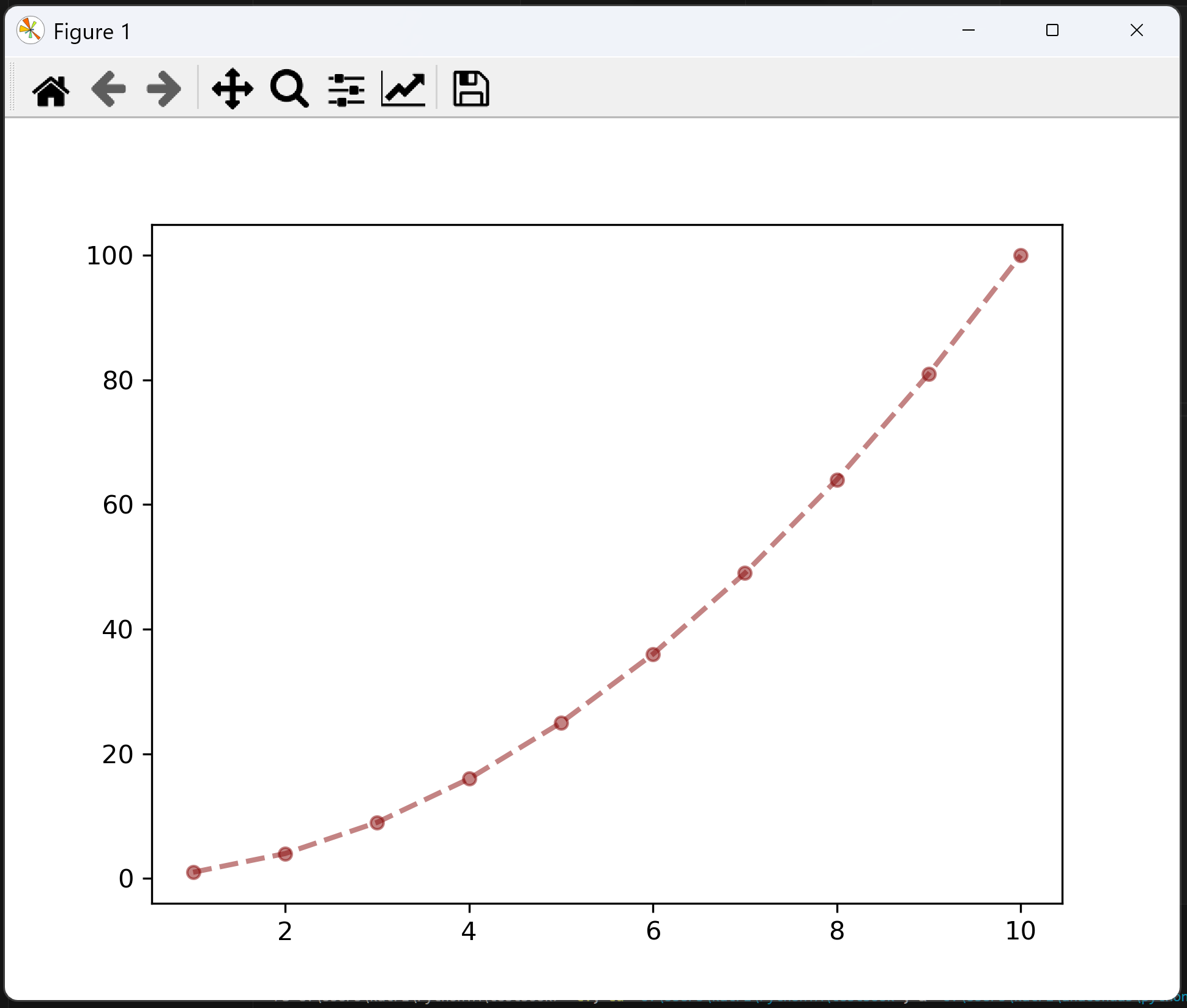 plt.plot(x, y, color="red", linestyle="--", linewidth=2, marker="o", markersize=5, alpha=0.5)